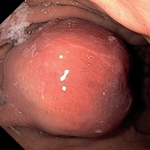 Пациенты с лейомиомами н/3 пищевода, как правило, предъявляли жалобы на дисфагию. Эндоскопическое исследование являлось основным инструментальным методом, позволившим на основании характерных эндоскопических признаков предположить диагноз доброкачественного гладкомышечного новообразования. На ФГДС находили образование в н/3 пищевода по передней боковой стенке справа (рис. 1,2). Гистология – лейомиома.